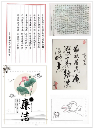 字行云流水,画传情达意。师生党员创作38个书法、漫画、海报、剪纸等形式多样的廉洁作品,本科生第三党支部书记彭菊红表示,学生党员创作热情很高,支部党员一笔一画认真抄写习近平总书记的廉政警句,并在支部廉政主题党日活动中展示钢笔书法作品,讲解警句背后的廉洁故事,这种形式对支部党员有很好的教育意义。